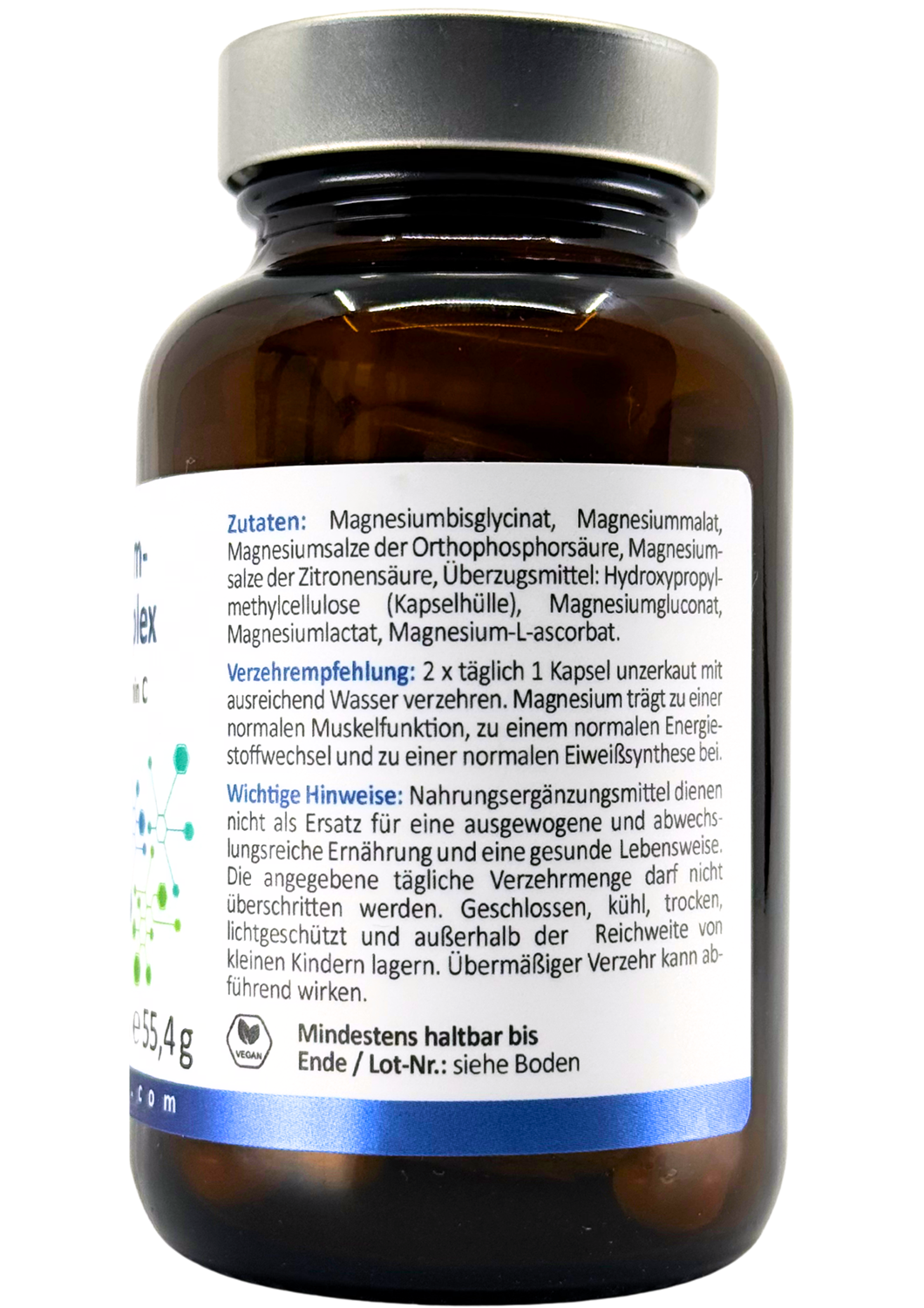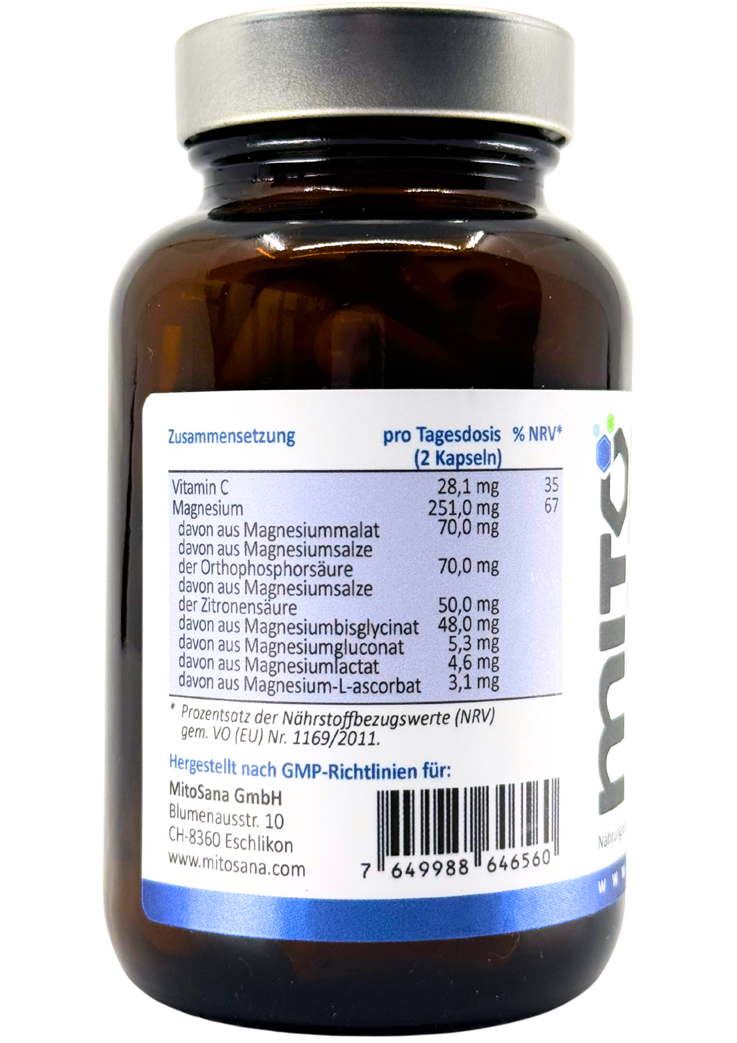 Zutaten: Magnesiumbisglycinat, Magnesiummalat, Magnesiumsalze der Orthophosphorsäure, Magnesiumsalze der Zitronensäure, Hydroxypropylmethylcellulose (Kapselhülle), Magnesiumgluconat, Magnesiumlactat, Magnesium-L-ascorbat
