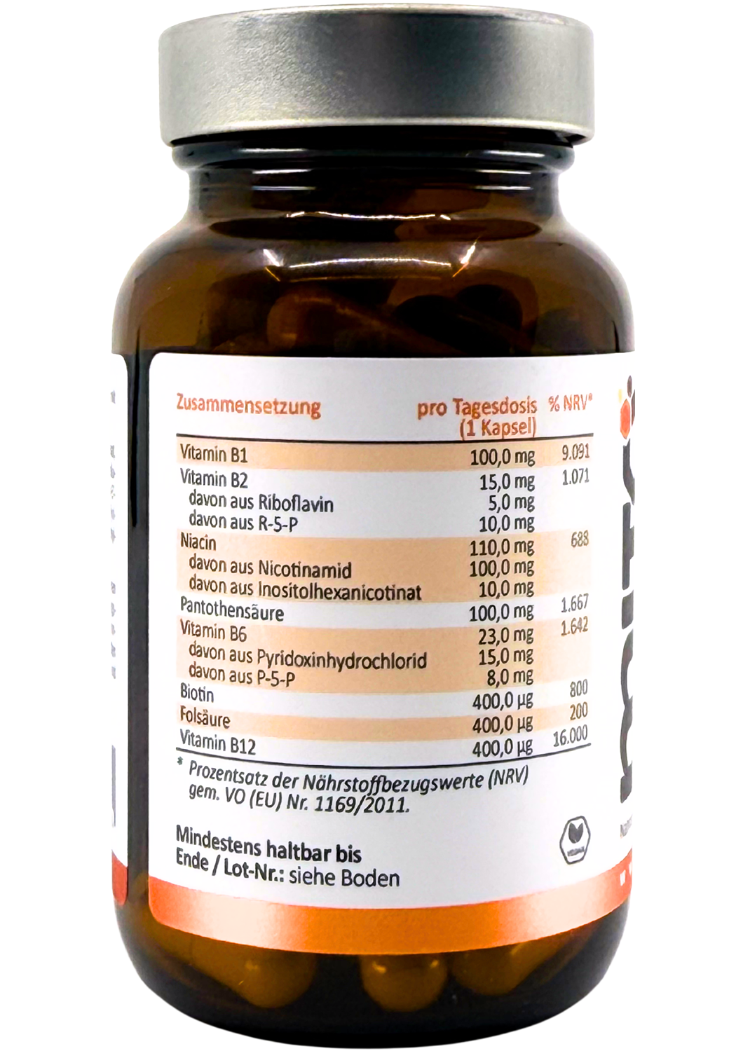 Vitamin B1 100mg (9'091% NRV*), Vitamin B2 15mg (1'071% NRV*), Niacin 110mg (688% NRV*), Pantothensäure 100mg (1'667% NRV), Vitamin B6 (1'642% NRV*), Biotin 400ug (800% NRV*), Folsäure 400ug (200% NRV*), Vitamin B12, 400ug (16'000% NRV*)