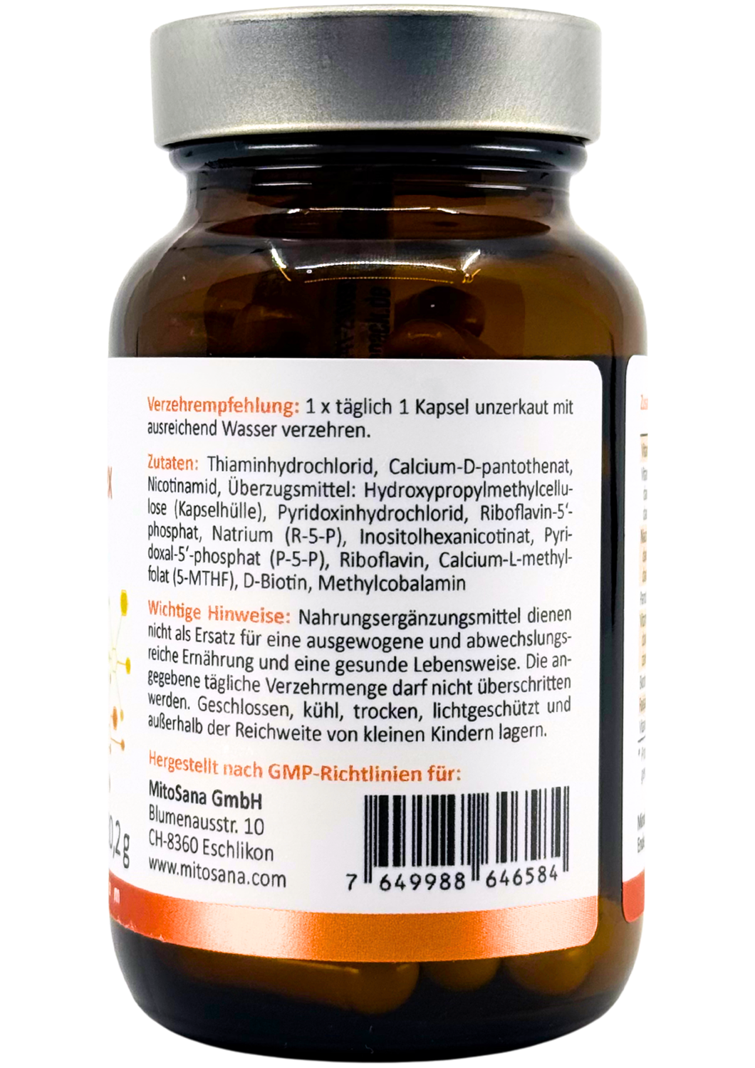 Thiaminhydrochlorid, Calcium-D-pantothenat, Nicotinamid, Überzugsmittel: Hydroxypropylmethylcellulose (Kapselhülle), Pyridoxinhydrochlorid, Riboflavin-5‘-phosphat, Natrium (R-5-P), Inositolhexanicotinat, Pyridoxal-5‘-phosphat (P-5-P), Riboflavin, Calcium-L-methylfolat (5-MTHF), D-Biotin, Methylcobalamin.